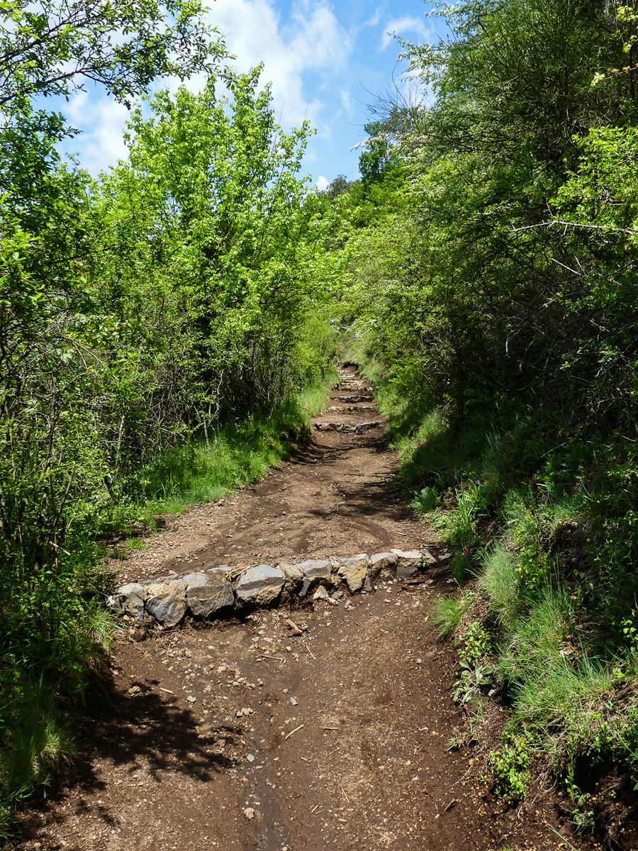 Histoire d’éliminer une ou deux tranches de saucisson, j’ai décidé d’aller voir la petite église construite au milieu du cratère du volcan Santa Margarida. Pour se garer, c’est simple, il y a un grand parking au pied du volcan. Ensuite, il suffit de suivre les indications sur les panneaux : 30 minutes de montée ! C’est un peu raide sur une bonne portion, et un poil glissant à cause du super orage de la veille au soir. Heureusement, le chemin est quand même bien ombragé !