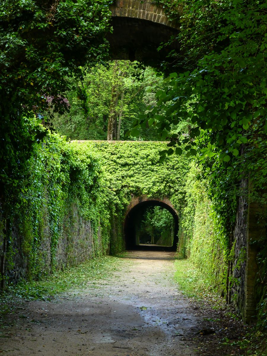 Nous commençons par emprunter la voie verte, qui est sur une ancienne voie de chemin de fer. Les anciennes gares ont été conservées, et tant mieux, car à peine parties depuis 10 minutes, nous avons dû nous abriter pour laisser passer un orage.
