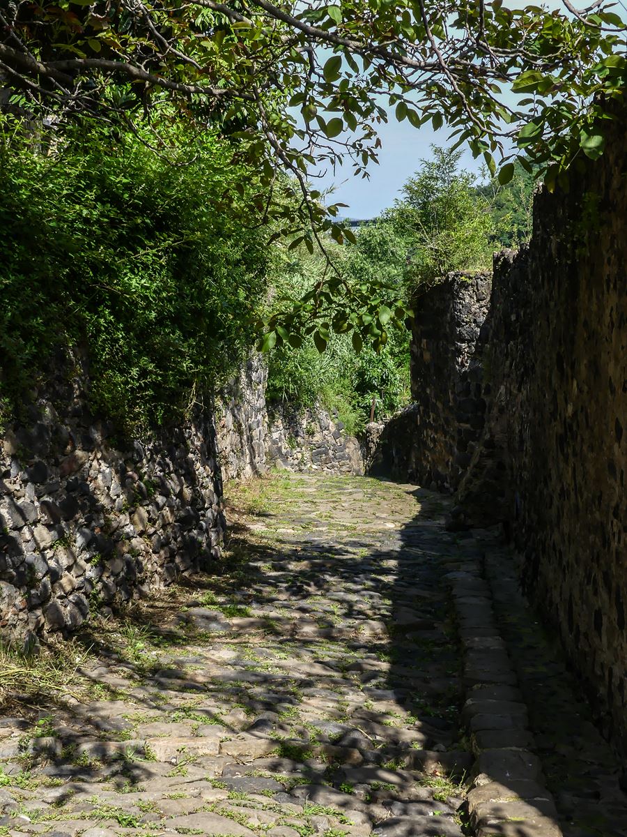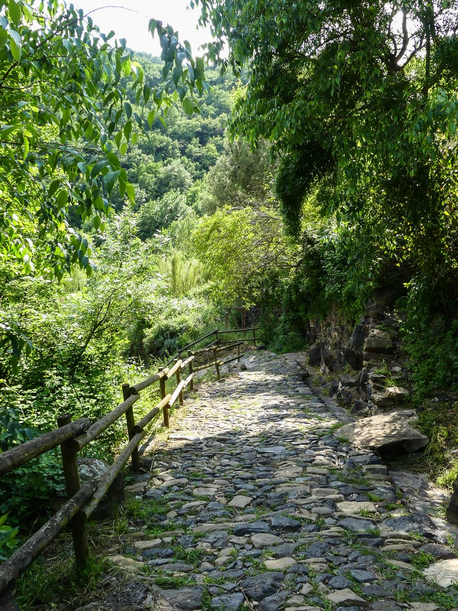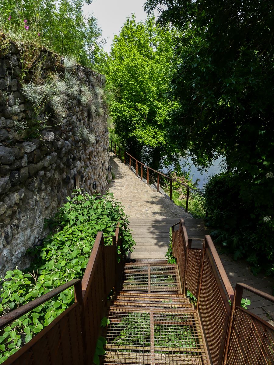 Arrivée en bas, je remarque que le pont romain en question est un pont métallique qui recouvre les vestiges de l’ancien pont. La vue sur le roc qui soutien le village est impressionnante. Je profite un peu plus longtemps du chant du ruisseau et m’arrête avant un grand pont. Je regretterai le soir même de ne pas l’avoir traversé car j’ai vu une photo magnifique prise depuis ce pont, un point de vue idéal !