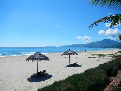 Nous roulons un moment et passons de belles collines au pied desquelles se trouvent des lacs et des jolies petites maisons et barques de pêcheurs. Malheureusement, nous ne nous sommes pas arrêtés. C’est finalement devant un grand hôtel en bord de mer que nous effectuons une pause ! Nous sommes à Danang sur la plage de Lang Cô.