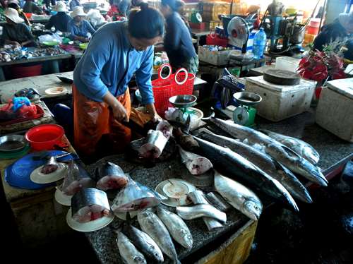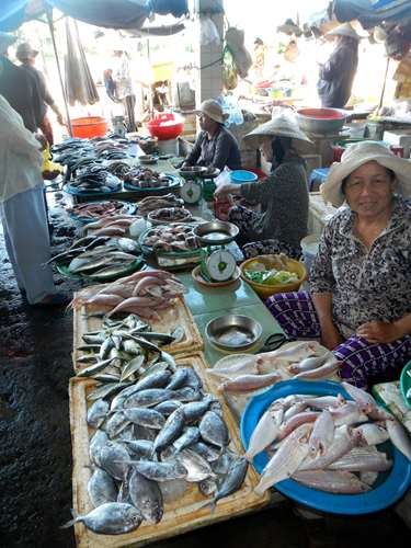 Là bas, il n’y a que des femmes qui vendent. En effet, les hommes, eux, se chargent d’amener la marchandise. Si vous voulez du poisson bien frais, arrivez de bonne heure ! La température monte très vite et les produits ne sont que parfois sur quelques glaçons… Il en va de même pour la viande d’ailleurs, simplement découpée et étalée sur des stands non réfrigérés.