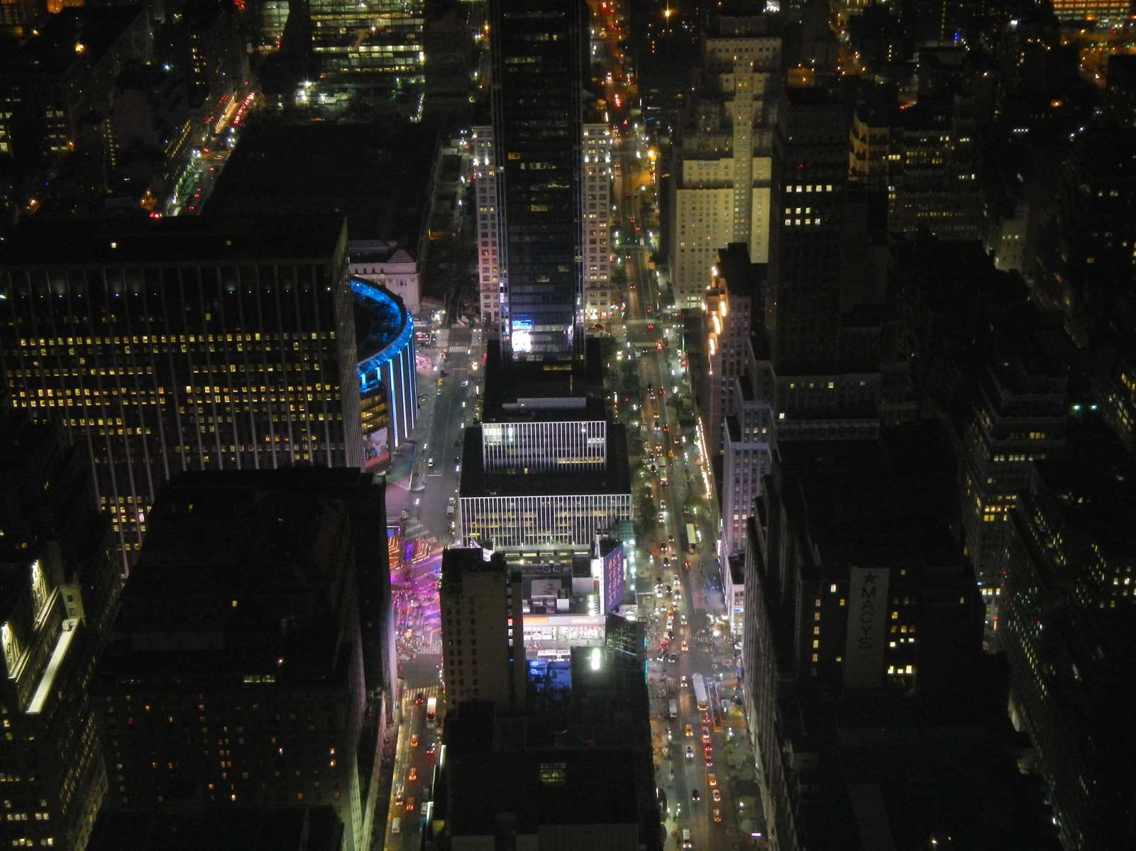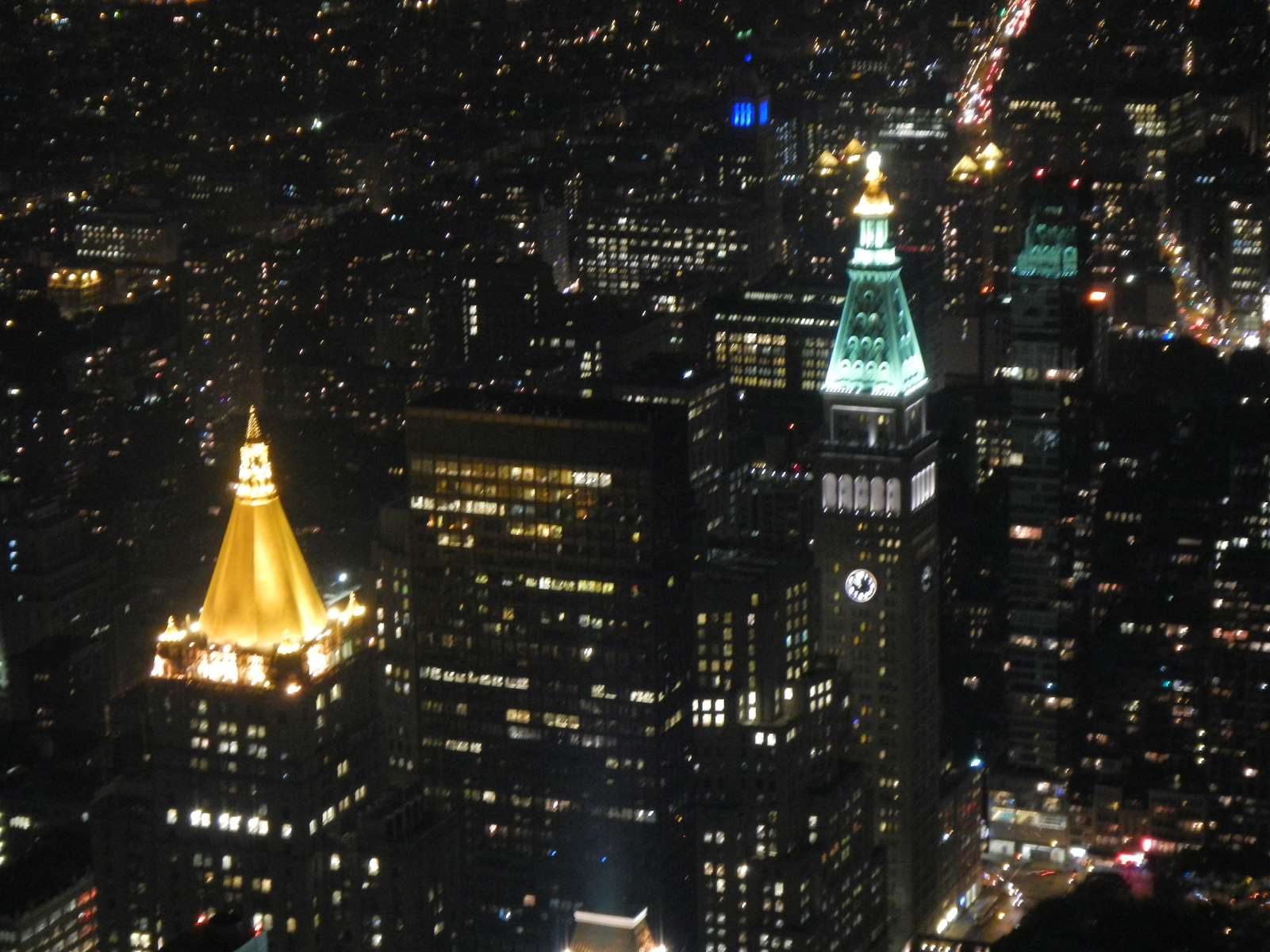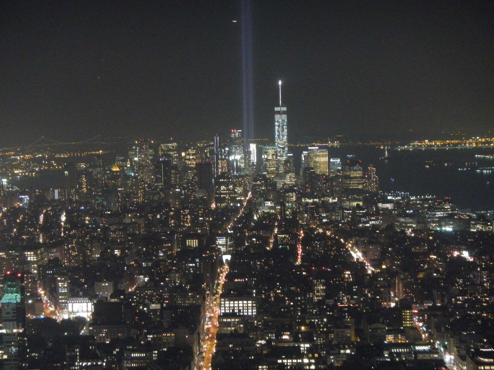Et ce n’est pas fini ! Grâce au city pass, j’ai une entrée de nuit pour l’Empire State Building le même jour que l’entrée du matin. Après un repas tranquille dans le coin, et le coucher de soleil passé pour éviter la foule, c’est le moment d’aller voir la ville depuis la celèbre tour. Au loin, nous pouvons voir des lasers qui étaient en phase de test pour la commémoration du 11 septembre (j’y étais début septembre en 2010).